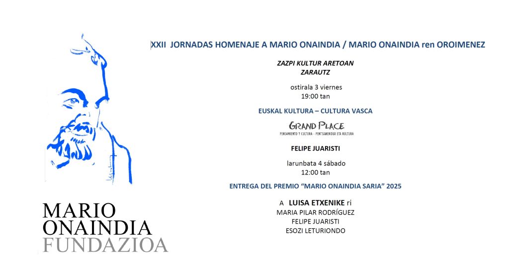 Los días 3 y 4 de octubre, en Zazpi kultur aretoa de Zarautz, se celebrarán, como todos los años, las jornadas en recuerdo y homenaje a Mario Onaindia. Se entregará el premio que lleva su nombre, a Luisa Etxenike.